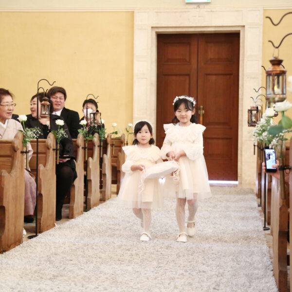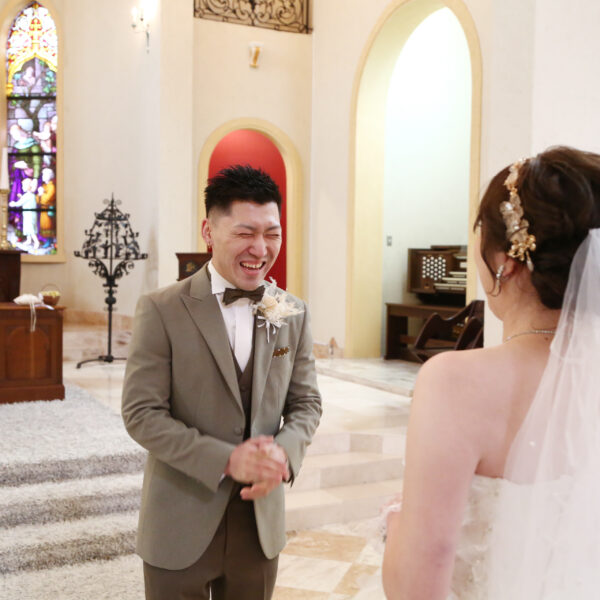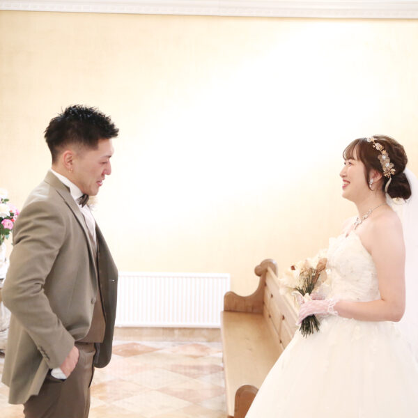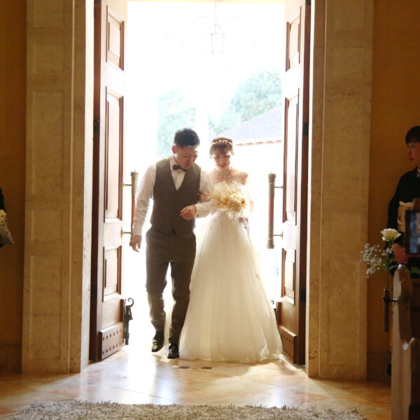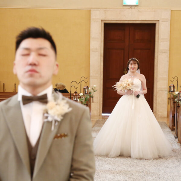 最初はフォトウエディングで終わる予定だったけど、チャペルを案内してもらった時に、正面のステンドグラスに感動してやっぱりここで式を挙げたい!と2人の意見が一致したので予定を変更して式を挙げることになりました。
