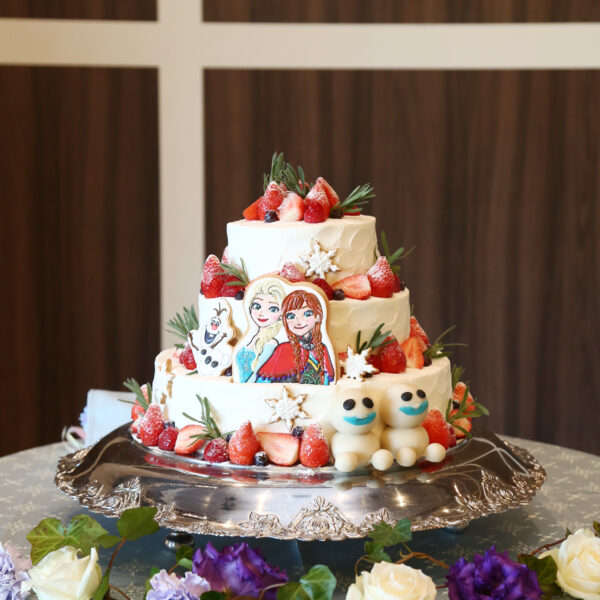 アナ雪の世界観に近づけるために、ペーパーアイテム・テーブルクロス等を工夫しました。